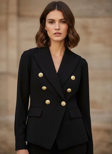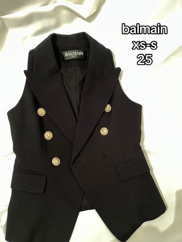 - Balmain qadın jileti – XS-S ölçü aralığı. Qara rəng, kəsimi “double-breasted” formalı, iri çiyin və ensiz beli vurğulayan siluet. Ön hissədə 6 ədəd qızılı rəngli relyefli düymə, iti döşü (lapel), iki ədəd qapaqlı yan cib. Parça qalın fakturalı, astarlı. Etiketdə “BALMAIN PARIS”.