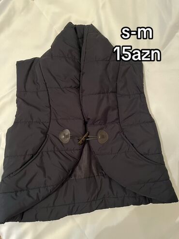 - Qara yüngül şişmə jilet – S-M ölçü aralığı. Ön tərəfdə iki böyük dairəvi tutacaqlı iplə bağlama, yanlarda dərin kəsimli ciblər. Yastı üfüqi tikiş xətləri, yüksək yaxa. 15 AZN mətnində göstərilib.