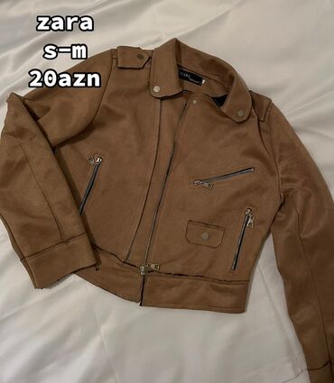 - Zara qısa dəri görünümlü gödəkcə – S-M ölçü aralığı. Süni dəri fakturalı qəhvəyi rəng, motosiklet stilində asimmetrik fermuarlı bağlama. Ön hissədə üç ədəd metal fermuarlı cib və bir düyməli kiçik cib, epolyetli çiyin detalları. 20 AZN mətnində göstərilib.