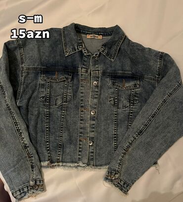 - Denim cins gödəkçə – S-M ölçü aralığı. Yuyulmuş boz-mavi ton, ön qapaqlı iki döş cib, tam düyməli bağlama. Alt hissə xırda püsküllü kəsim. 15 AZN mətnində göstərilib.