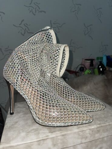 EndirimsizŞəffaf materialdan hazırlanmış, parıltılı tor (mesh) örtüklü, nazik dabanlı qadın tuflisi.