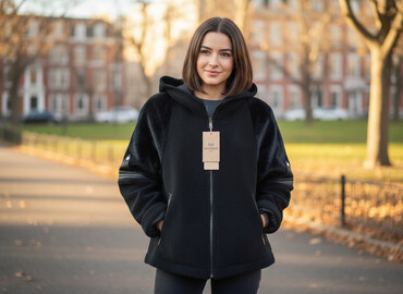 Digər parçaQara rəngdə qadın üst geyimi –Kurtka kapüşonlu, ön hissəsi tam fermuarlı model. Materialı yumşaq, isti tutumlu toxumadan hazırlanıb; çiyin və yan panellərdə məxməri/plyuş effektli parça detalları var. İki yan cib fermuarlıdır. Qollarında dekorativ düymə və fermuar detalları mövcuddur. Rahat, gündəlik və şəhər stilinə uyğun, sərin havalar üçün ideal. Minimalist dizayn, bədənə oturan kəsim, aşağı hissədə yüngül ətək açılımı. Rəng: klassik qara. Kapüşon əlavə küləkdən qorunma verir.