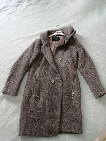 Qadın palto – klassik boz rəng, “VAZELI’S” etiketli. - Dizayn: iki cərgəli düymələmə, geniş qatlana bilən yaxalıq - Naxış: xırda “sibirka/soyuducu balığı” (herringbone) deseni - Kəsim: dizə qədər u...