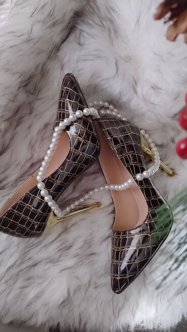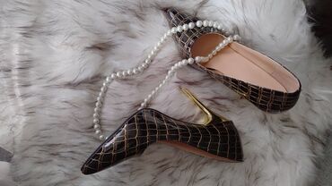 EndirimsizQadın klassik tufliləri – tünd qara/şokolad rəngli, qızılı konturlu kroko naxışlı üstlük, parlaq faktura. İti burunlu dizayn, nazik və hündur metal topuq (qızılı rəng). Daxili hissə açıq bej rəngdə, yumşaq astarlı. Zərif, şıq və diqqətçəkən stil – ziyafət, ofis və xüsusi tədbirlər üçün idealdır. Minimalist siluet, ayağı vizual olaraq incə göstərən kəsim. Topuq sabit quruluşa malikdir, altlıq sürüşməni azaldan materialdandır. Naxışlı üstlük təmizlənməsi asan, parıltını yaxşı saxlayır. Şıq aksessuarlarla (mirvari kolye və s.) rahat kombinlənir.