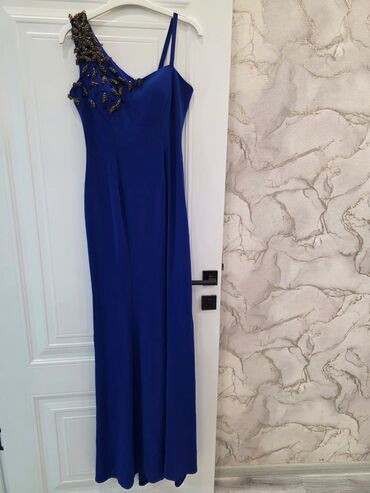 Zərif gecə/libas – kobalt mavi rəngdə, birqollu dizayn.