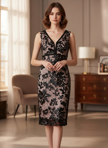 Məhsul: Parıltılı qısa gecə donu - Rəng: qara fon üzərində gümüşü payetlər - Siluet: bədənə oturan mini uzunluq - Yaxa: qapalı/yuvarlaq - Qol: qısa, yüngülcə enli kəsim - Material: tam səth boyunc...