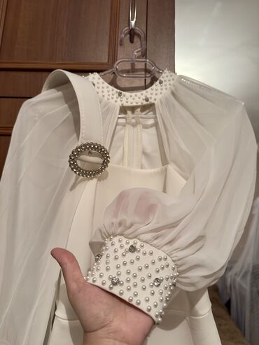 Платье было надето всего один раз — на помолвке. Размер M. На сильном освещении выглядит таким же блестящим, как на фото. Жемчужные и каменные детали красиво переливаются при свете. Заинтересовавшиеся могут написать в WhatsApp.