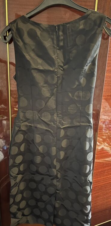 Qara rəngli zərif qadın donu. - Model: dizə qədər uzunluq, bədənə oturan siluet (sheath/kokteyl tərzi) - Naxış: parça üzərində böyük dairəvi (polka dot) tekstural print, parlaq-mat effektli - Yaxa:...