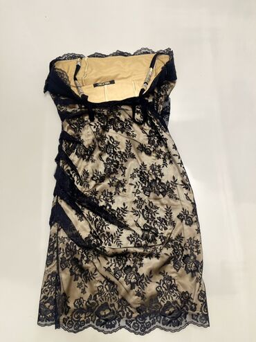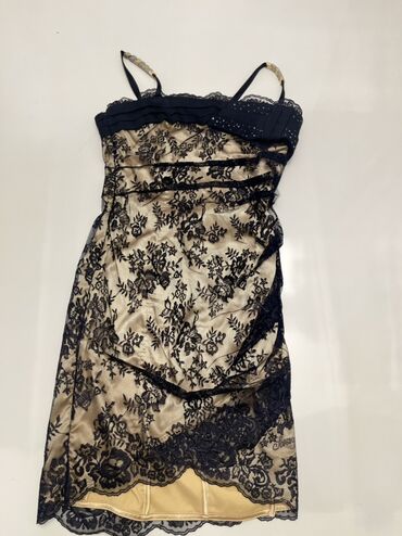 Sassofono markalı qısa kokteyl/ziyafət donu.34/XS olcu - Rənglər: qara, boz və bej-qızılı tonlarda kombin. - Parça: parlaq atlas effektli əsas material, ön hissədə və ətəkdə qızılı-bej tor üzərind...
