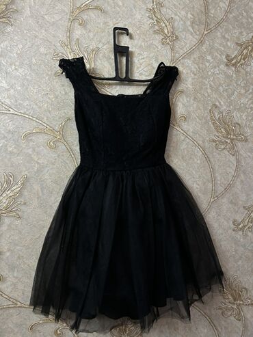 Qara kokteyl paltarı – tüllü ətəkli, dizdən yuxarı model 12-14 yaş üçün uyğundur - Rəng: qara - Siluet: beldən yığılan, A-kəsim - Üst hissə: elastik parça, çiyinləri açıq görünüş verən enli yaxa x...