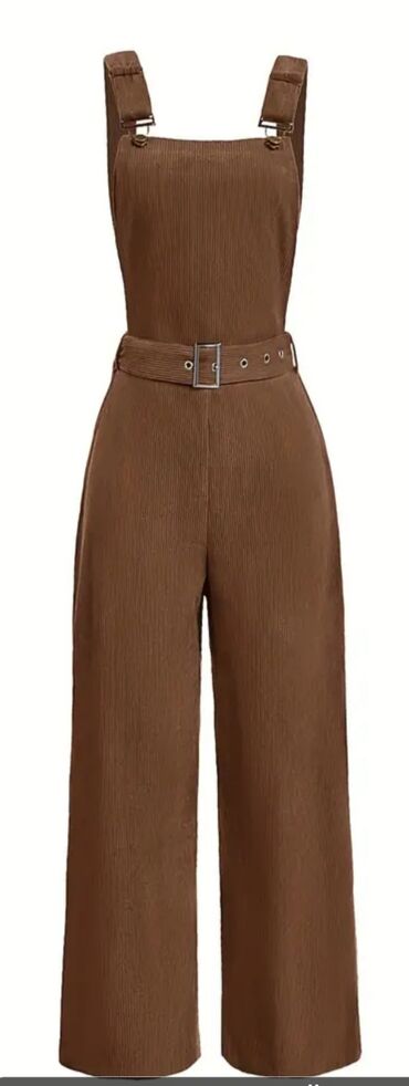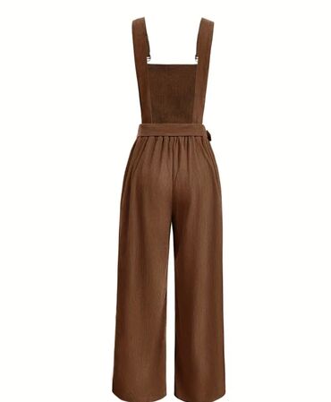 Qadın kombinezonu – qəhvəyi rəngdə, incə cizgili (mikro-qabarıq) toxumalı parça. Üst hissə düz bib-li dizaynda, geniş tənzimlənən askılar metal tokalarla bərkidilir. Bel xəttini vurğulayan eyni parçadan kəmər və kvadrat metal toka mövcuddur, bir neçə deşiklə ölçü nizamlanır. Şalvar hissəsi hündür bel kəsimlidir, arxa hissədə yüngül büzgülər var. Bacaqları düz kəsimli və enli, 7/8–tam uzunluq arası. Ön-arka panel minimalistik, cərgə tikişlər səliqəli. Payız-qış mövsümü və gündəlik/şəhər stili üçün uyğun, içliksiz. Rəng: isti şabalıd-qəhvəyi. Stil ipucu: darfason köynək, boğazlı sviter və ya t-shirt ilə kombinlənir; idman ayaqqabısı, mokasin və çəkmələrlə rahat görünüş yaradır.