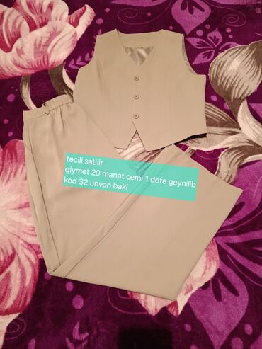 - Qadın üçlük kostyum: krem rəng şalvar və düyməli jilet. Cəmi 1 dəfə geyinilib. Qiymət: 20 manat. Kod: 32. Ünvan: Bakı.