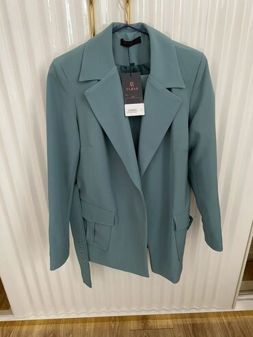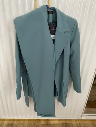 Zeytun-yaşıl rəngdə qadın kostyumu - İki hissə: düz kəsimli şalvar və klassik yaxalıqlı qısa bleizer - Minimalist dizayn, hamar parça, astarlı bleizer - Bleizerdə ön hissədə qapanma üçün gizli düym...