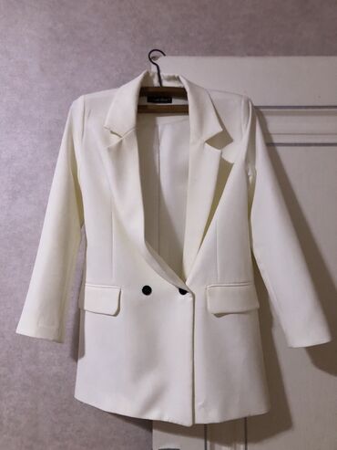 Ağ rəngli qadın kostyum dəsti – pencək və klassik şalvardan ibarət. - Brend: Poolharyco (etiket üzərində görünür) - Rəng: süt-ağ/ivori - Pencək: ikiqat düymələmə (ön hissədə iki qara düymə), manjet...