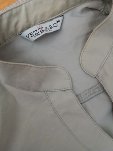 SARA brendi, ölçü 36. - Rəng: açıq krem - Model: qısaqol, düz kəsimli, dizə yaxın uzunluq - Yaxa: dairəvi - Bəzək: ön hissədə üç ədəd gümüşü parlaq lent-fiqa aplikasiyası - Detallar: ön tərəfdə in...