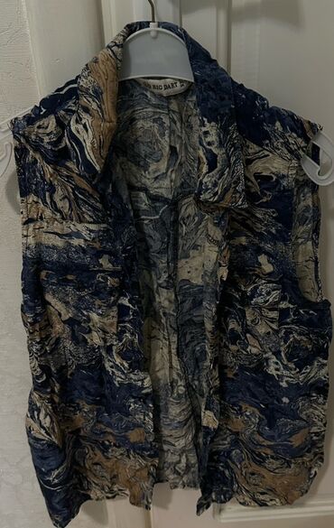 - “Big Dart” markalı qolsuz üst: mavi-bej mərmər effektli print, geniş yaxalı, yanlarda praktiki ciblər, yüngül və rahat kəsim. jeans ilə uyğun.