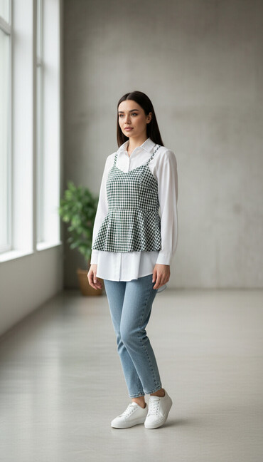 - Ağ uzunqollu köynək + üstündən geyinilən yaşıl-ağ dama (gingham) naxışlı korset/üst paltar