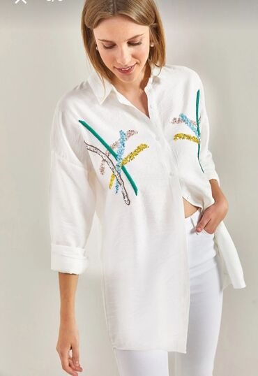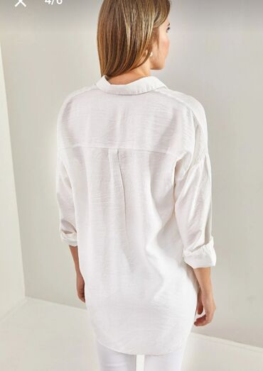 Ağ rəngli qadın köynəyi - Parça: fakturalı/teksturalı (yüngül, hava alan), elastiksiz görünüş - Dizayn: klassik yaxalıq, ön hissədə düyməli bağlanma - Kəsim: qısa uzunluq (cropped), arxa hissəsi y...