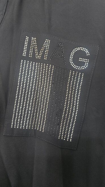 Qara rəngdə, uzunqol, asimmetrik dizaynlı köynək. Bir tərəfi iri hərflərlə bəzədilib, digər tərəfində isə kiçik daşlarla işlənmiş cib detalı var. Gündəlik geyim üçün rahat və dəbli seçimdir.