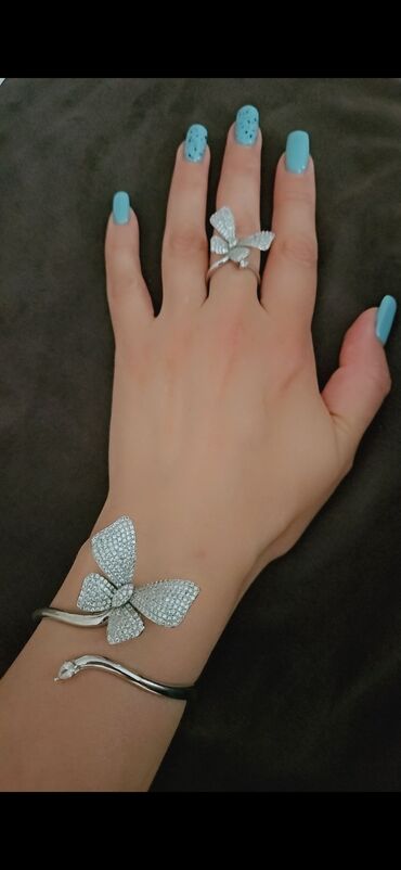 - Dizayn: Parlaq daşlarla bəzədilmiş iri kəpənək motivi. Bilərzik açıq formadadır, uclarından biri damla formalı daşla tamamlanıb, kəpənək elementi biləyin üstündə yerləşir. Üzükdə eyni kəpənək motivi var və barmaqda göstərişli görünüş yaradır.