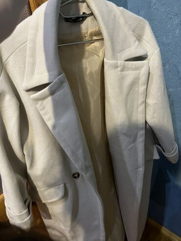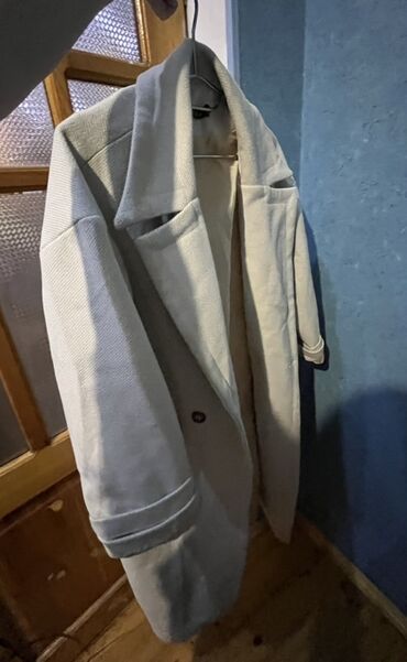 Yenidi yeni geyim ile barter var Uzun qadın palto - Rəng: açıq bej/ekru - Model: klassik, uzun ölçü; oversize kəsim - Yaxa: geniş haşiyəli (notched lapel) - Bağlama: ikiqat düymələmə görüntüsü, ö...