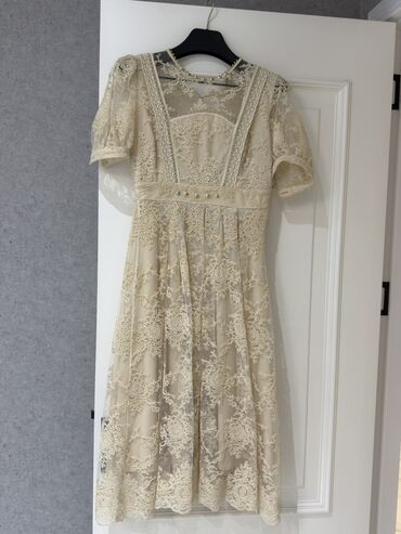 - Yaxa və bəzəklər: Dairəvi yaxa, incə krujeva lent detalları və bel hissəsində mirvari düyməcik dekoru