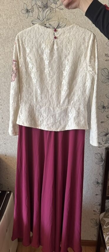 - Model: uzun ətəkli paltar, üst hissəsi krujeva (ağ) jaket-effektli, alt hissəsi tünd fuşya rəngində geniş, axıcı ətək.