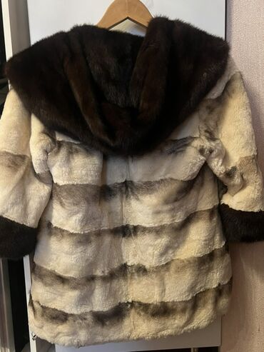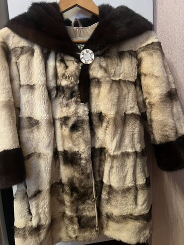 O’merinos (Design by Italy) markalı qadın kürkü - Model: kapüşonlu, uzun ölçülü şuba norka - Material: yumşaq xəz (etiket: O’merinos) - Rəng və naxış: krem-bej əsas, tünd qəhvəyi-boz şaquli ton ke...
