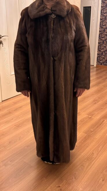 Boyuk beden 48 -50 Qadın kürkü – tünd qəhvəyi/qartal qarası tonlarda, klassik uzun kəsim. Xüsusiyyətlər: - Material: təbii xəz (mink görünüşlü), sıx və parlaq tüklü tekstura - Model: uzun palto t...