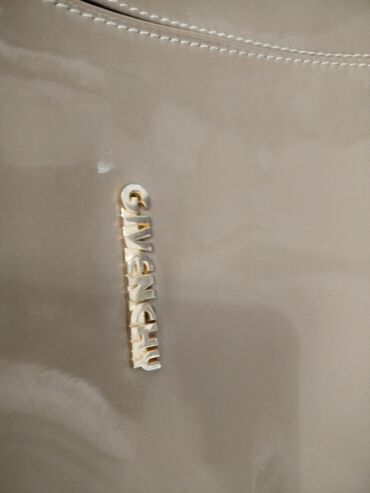Qadın çantası – Givenchy yazılı, bej rəngli, parlaq (lak effekti) səthli.