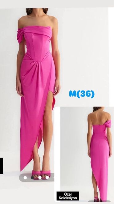 - Dizayn: açıq çiyin, büzgülü ön detal, assimetrik ətək kəsimi və yan yarıq