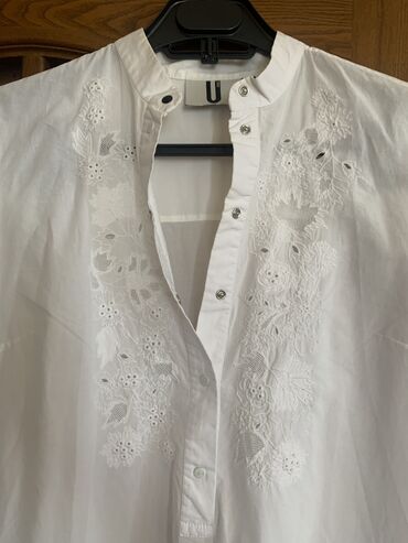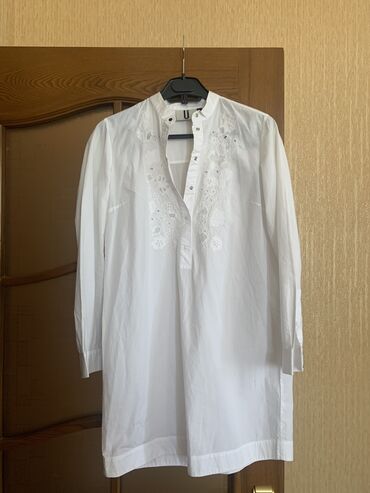 Ağ rəngli, uzunqol, düyməli, zərif naxışlı tunik. Yüngül materialı
