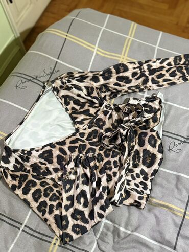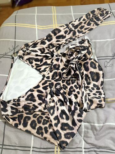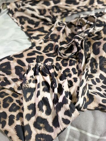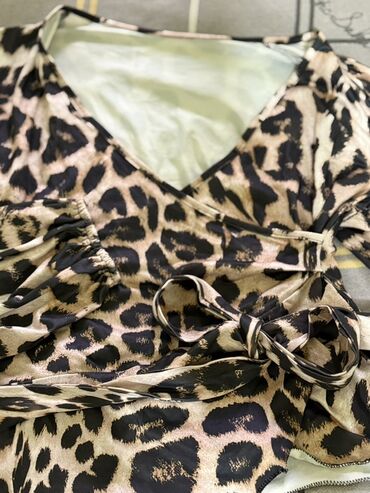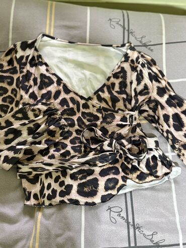 Leopar naxışlı qadın köynəyi/bluz. - Rəng: isti narıncı-tonlarda leopar printi, qara ləkələrlə. - Model: uzunqol, elastik manjetli qollar; qısa stend-yaxa (yarı boğaz). - Kəsim: rahat, düz silue...