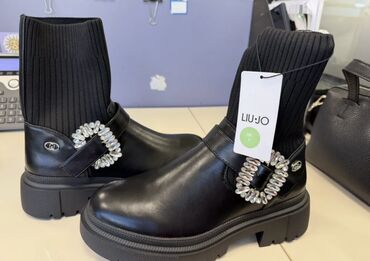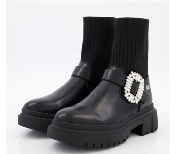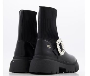 Scarpe Milano qadın botları - Rəng: qara - Material: parıldayan daşlarla bəzədilmiş toxumalı üst (tam parıltı effekti) - Model: dar burunlu, ayaq biləyi hündürlüyündə - Daban: hündür, qalın blok d...