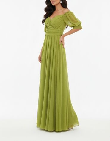 1dəfə geyinilib Zümrüd-yaşıl rəngdə uzun ziyafət/libas. - Off-shoulder (açıq çiyinli) dizayn, sinə hissəsində dalğalı, həcimli büzgülər. - Şəffaf şifon materialdan geniş, fəncərli uzun qollar. -...