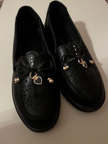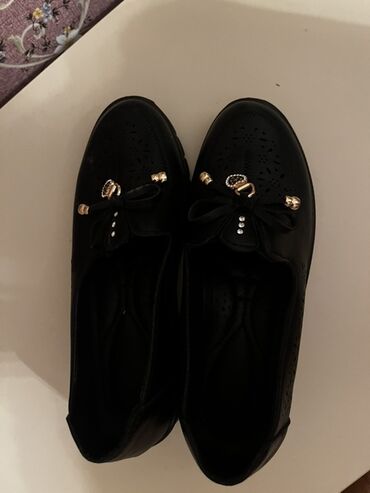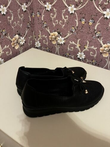 Qadın loafer ayaqqabıları 1 dəfə geyinilib. - Rəng: qara - Material: süet görünüşlü üstlük, içlik süni dəri - Dizayn: üst hissədə qızılı metal aksesuar, dekorativ tikiş detalları - Daban: yüngül, ...
