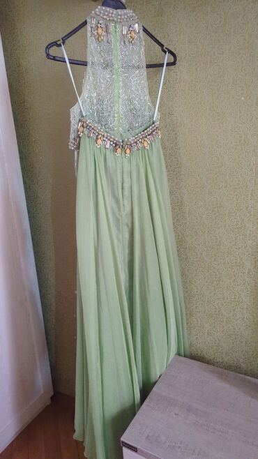 Yaxası və bədən hissəsi boncuklarla bəzədilmiş, yaşıl rəngli qadın maksi donu. Şifon ətək hissəsi yüngül və axıcı görünüş verir, bu da onu müxtəlif tədbirlər üçün uyğun edir. Yaxalıq dizaynı və bədən hissəsindəki detallar donu daha cəlbedici edir.