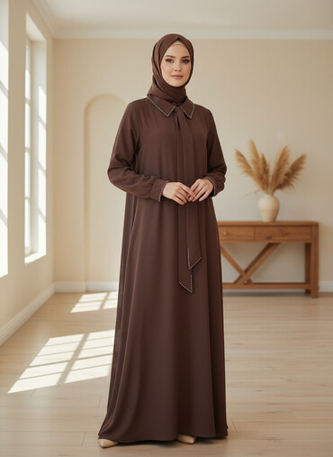 Bej rəngli, qısa qollu, maksi uzunluqlu don, üzərində naxışlar və muncuq detalları ilə bəzədilmişdir. Donun V-yaxası var və qolları açılan tiplidir. Parlaq naxışlar və mirvari bəzəklər ona zərif gö...