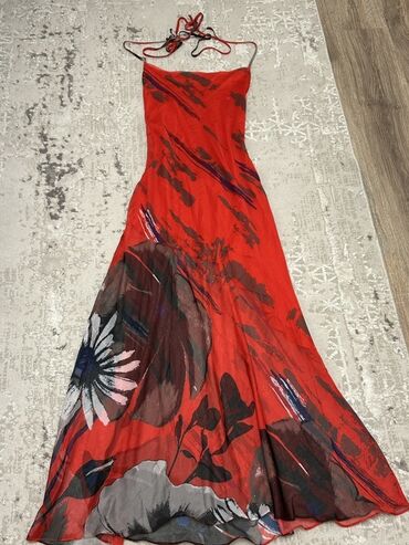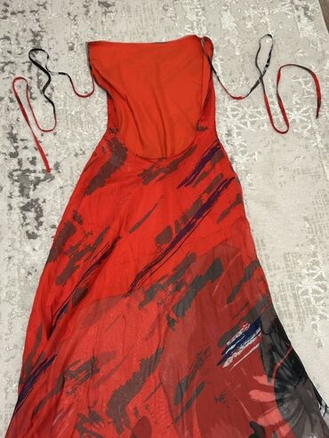 Qırmızı rəngli uzun paltar - Parlaq, yumşaq fakturalı parça - V-yaxa, örtməli (wrap) üst hissə - Qısa qol - Kəmərli bel: eyni parça ilə, düymə detallı - Aşağı hissədə yan/ön yarıq - A-formalı, axı...