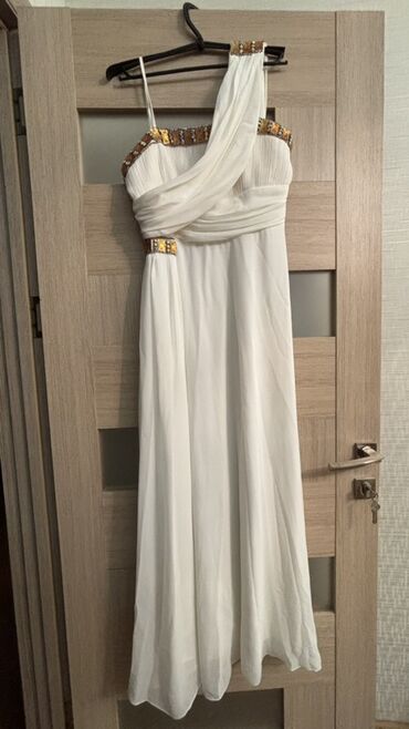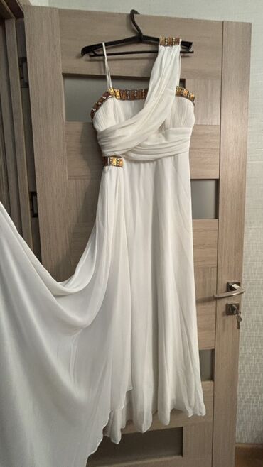 Ağ rəngli, uzun ziyafət/gecə libası. - Dizayn: Tək çiyinli (one-shoulder) kəsim, asimmetrik üst hissə. - Material: Parlaq, axıcı atlas-saten fakturalı parça. - Detal: Bel hissəsində zərif qızılı zə...