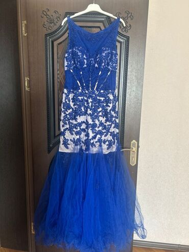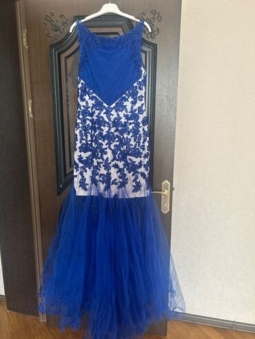 Mavi rəngdə uzun ziyafət/libas 38 ölçü - Model: Uzun,balıq effektli ətək. - Parça: Üzərində güllü naxışlı krujeva (dantel) qat; alt hissədə hamar astar. - Üst hissə: Şəffaf tül yaxa və çiyinlər; ür...