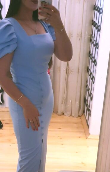 Göy rəngdə, şık dizaynlı qadın paltarı. (45 manata alınıb) - Model: ikiqat düyməli ön hissə, V-yaxa, krujeva deyilən incə haşiyə xətti ilə. - Qol: qısa, yığma effektli buf qol. -Ətək hissəsi: hər i...