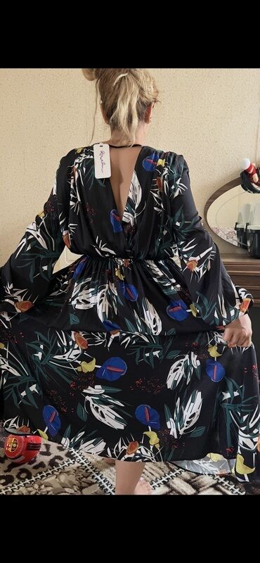 - Model: kəmərli, büzgülü bel, V‑şəkilli dekolte (öndə və arxada çarpaz kəsim effekti), uzun şifon qol.