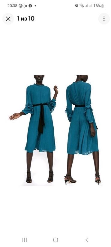 Zara Zərif qadın paltarı – midi uzunluqda, tünd firuzəyi rəngdə.