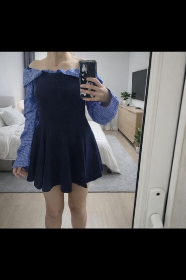 Navy rəngli mini don – qarışıq material dizaynı. Yuxarı hissə açıq çiyinlidir, büzgülü volantlı yaxa detallıdır. Gövdə hissəsi tünd mavi, yumşaq və elastik parça ilə bədənə oturan kəsimdədir; ətək hissəsi qısa və ətəklənmişdir. Qollar kontrast olaraq xırda dama-dama naxışlı mavi parça ilə hazırlanıb, uzun və rahat kəsimlidir. Gündəlik geyimdən tutmuş görüşlərə və xüsusi günlərə qədər uyğun, modern və fərqli görünüş yaradır.