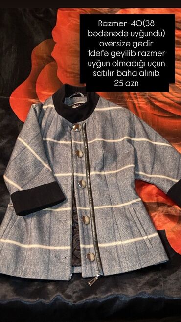 Qısa paltar/şalvar üstündə rahat oturan, şəhər üslubunda geniş siluetli modeldir. Şəkildə qeyd: 1 dəfə geyinilib, ölçü uyğun olmadığı üçün satılır; baha alınıb; 25 AZN.