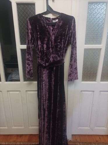 Məhsul: Qadın uzun paltar Geyinilmiyibdi Heç Təzədir - Boy 145cm Ölçü 44 Razmer - Material: Eyni parıltılı, məxməri/velür fakturalı parça - Rəng: Tünd bənövşəyi (şəra...
