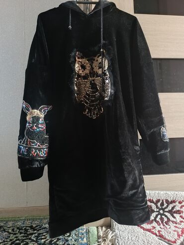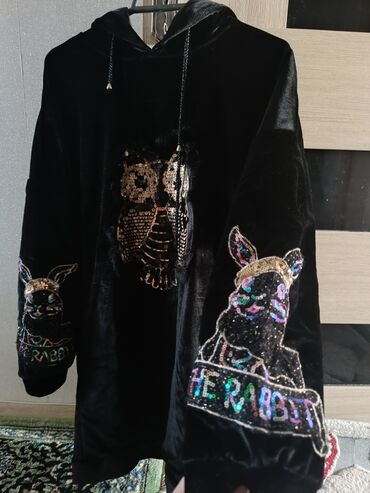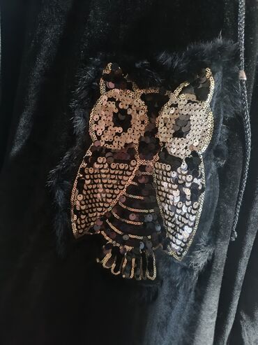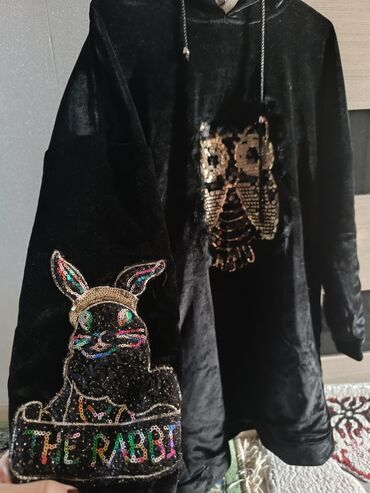 - Bəzək: ön hissədə iri parlaq pulcuklardan (payet) hazırlanmış bayquş aplikasiyası, ətrafı tüklü faktura ilə vurğulanıb; hər iki qolda rəngli payetlərlə “THE RABBIT” yazılı dovşan aplikasiyası