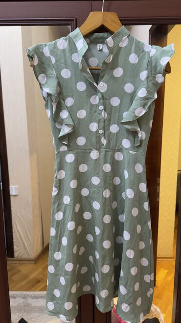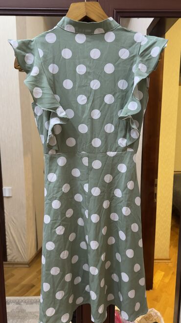 - Qadın paltarı, yaşıl (səssiz/zeytun tonu) fon üzərində iri ağ nöqtəli print