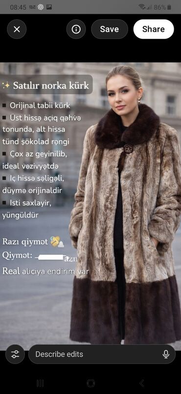 Qadın norka ilə sobol kürkü – təbii xəz, dizə qədər.44-46-48 qeder.az geyinilib.uztundə əlcək sutkada verecem - Rəng: bej və tünd-qəhvəyi tonların kombinasiyası, deqrade/naxışlı effekt - Uzunluq:...